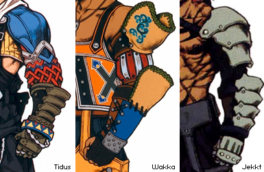 Allgemein:Typisch für einen Profisportler ist Tidus muskulös und gut gebaut. Durch seinen dunklen Teint und das locker fallende, scheinbar blondierte Haar, könnte man ihn ohne Probleme als Sunny/Beach-Boy durchgehen lassen. Passend zu seinem Talent in der Wassersportart "Blitzball", ist auch seine ozean-blaue Augenfarbe. Sein selbstbewusstes Erscheinungsbild lässt viele Frauenherzen höher schlagen.Etwas auffällig ist der Unterschied zwischen den Full Motion Videos und der Ingame Grafik. Tidus hat in den Full Motion Videos ein leicht asiatisch aussehendes Gesicht, wohingegen er auf Artworks und In-Game recht europäisch aussieht. Kleidung:Tidus wird in Spira oft auf seine auffällige Kleidung angesprochen, da er trotz des teils sehr bunten und extravaganten Kleidungsstils der Bewohner Spiras deutlich aus dem Rahmen fällt.Wir lernen Tidus kurz vor einem seiner wichtigsten Blitzballspiele mit seiner Mannschaft, den "Zanarkand Abes" kennen und wissen, dass seine Mannschaftskollegen Kleidung im ähnlichen Farbschema tragen. Man kann also davon ausgehen, dass dies sein Mannschafts-Outfit ist und vor allem auf das Blitzball spielen ausgerichtet ist. Tidus scheint jedoch zu seinem Blitzballteam eine besonders starke Bindung zu haben. So trägt er das Zanarkand Abes Logo nicht nur auf seiner Kleidung, sondern auch in Form von Schmuck. Wie man aber vor allem an seinem Vater Jekkt und an Wakka sehen kann, scheinen leidenschaftliche Blitzballspieler auch in ihrer Freizeit in voller Blitzball-Montur aufzutreten und leben dadurch ihren Stolz auf ihr Team und die Leidenschaft zum Blitzball voll aus. Diese Leidenschaft geht bei einigen soweit, dass sie sich wie z.B. Jekkt, das Teamlogo auf den gesamten Oberkörper tätowieren. Anhand der ausgefallenen Rüstung an seinem linken Arm, kann man Tidus' Rang als Kapitän seiner Mannschaft erkennen. Auch Jekkt und Wakka tragen diese Verstärkung am linken Arm, welche sich von der Schulter bis über die Hand hinausstreckt. Es ist unklar, welchen Nutzen genau diese Rüstung hat, da nicht jeder Blitzballspieler sie trägt. Ich denke, dass sie zum größten Teil einfach ein Merkmal des Mannschafts-Kapitäns ist und sowohl Stärke als auch Unverwundbarkeit ausstrahlen soll.